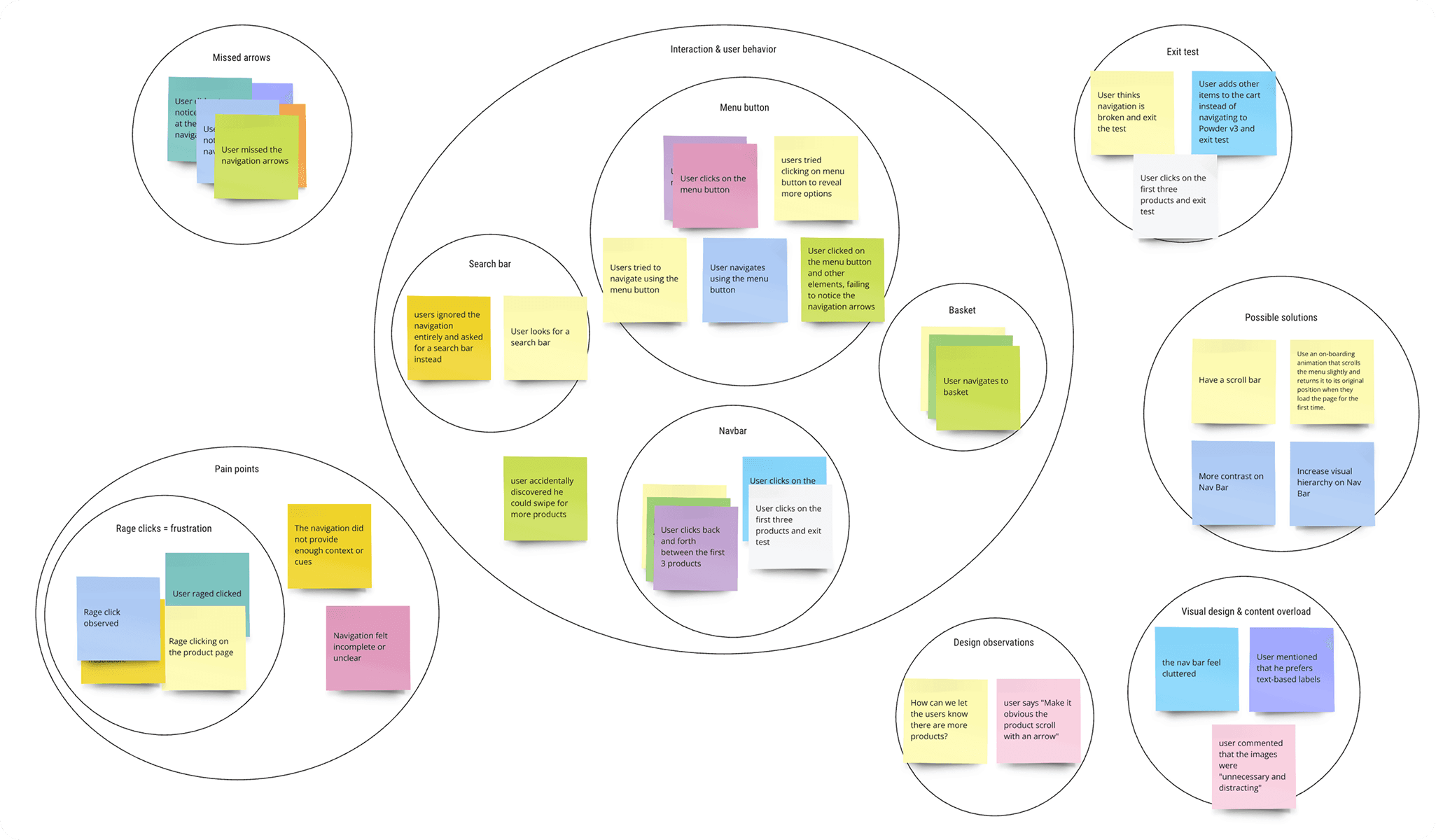 Building on our initial research, we re-evaluated the navigation system by analyzing user behavior and synthesizing insights through an affinity diagram.