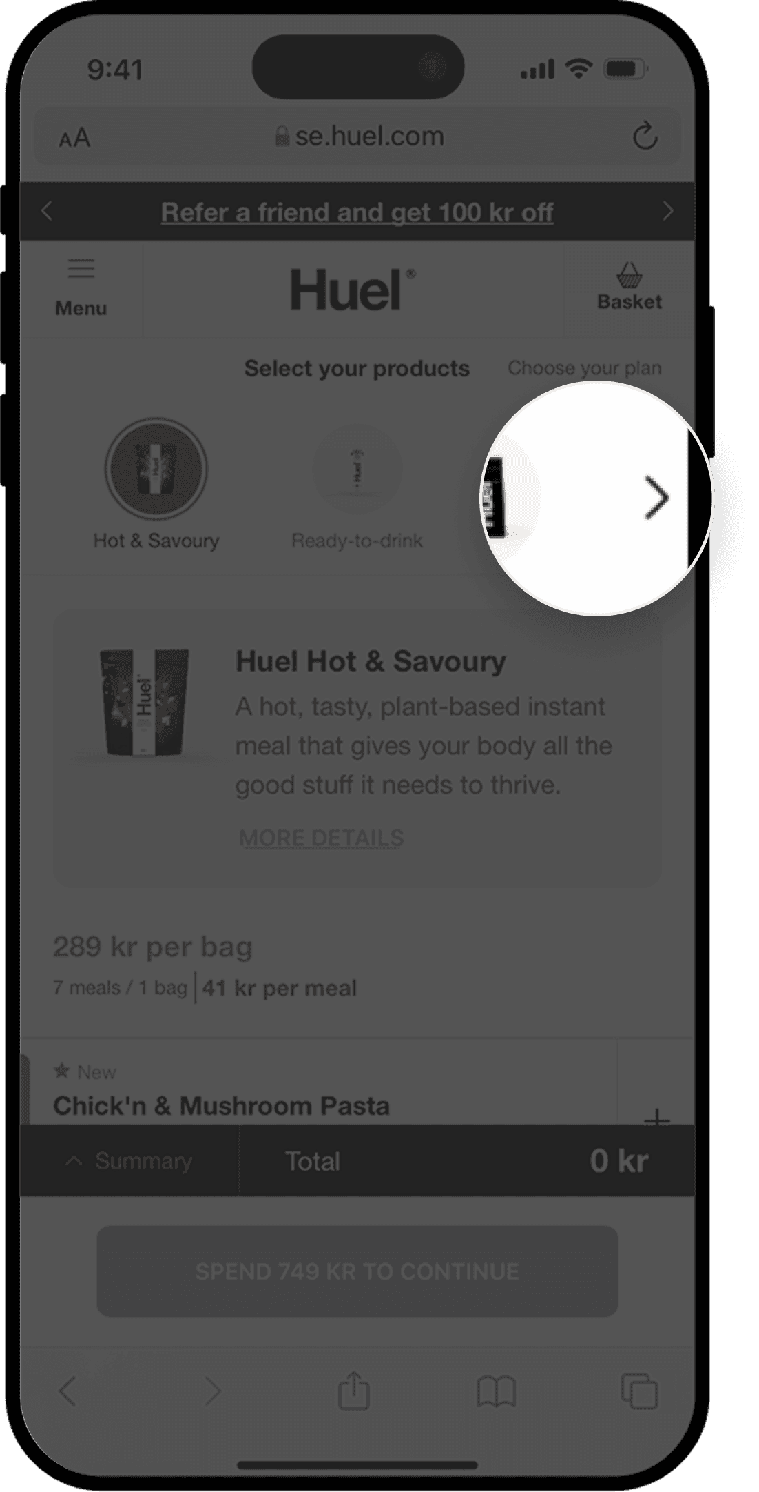 Our initial solution was a subtle right-facing arrow at the edge of the product carousel, suggesting that more products could be discovered by swiping. We then moved on to additional testing.